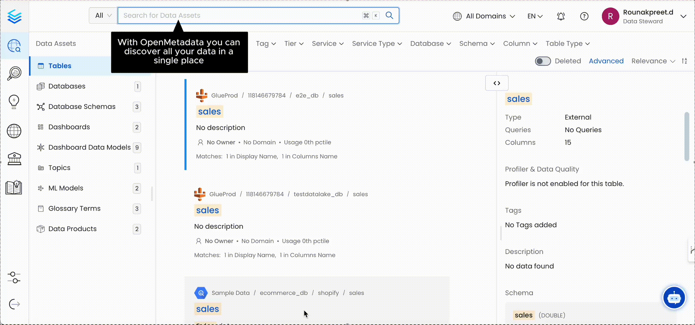 OpenMetadata provides a user-friendly interface for data discovery. OpenMetadata enables you to discover your data using a variety of strategies, including: keyword search, data associations (e.g., frequently joined tables, lineage), and complex queries. Using OpenMetadata you can search across tables, topics, dashboards, pipelines, ML models, containers, glossaries, and tags. OpenMetadata supports detailed metadata for assets and their components (e.g., columns, charts), including support for complex data types such as arrays and structs. Users can get a complete picture of their data by viewing the data evolution tracked using lineage and metadata versioning.